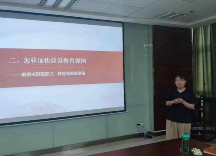 领悟习近平总书记的讲话精神,面对怎样加快建设教育强国、怎样强教强师等问题,潘红霞老师从党的领导、办学方向、根本任务三个方面展开此次党课。